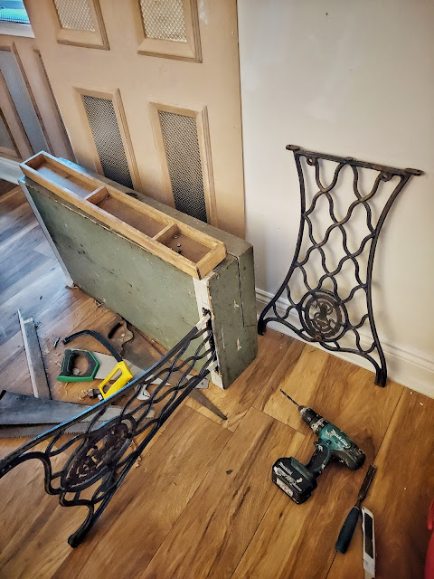 We where racking oor brains last night trying to figure out what legs we would like for the old handmade joiners toolbox/desk. I really didnt want to buy anything new and we where contemplating getting iron legs made. When it hit me...I forgot I had 2 singer bases to make a farmhouse table with in the kitchen. With JDs skills we could use a singer base on the desk and one for the table!! I asked him and he said yes as always.... Excited I was hahaha